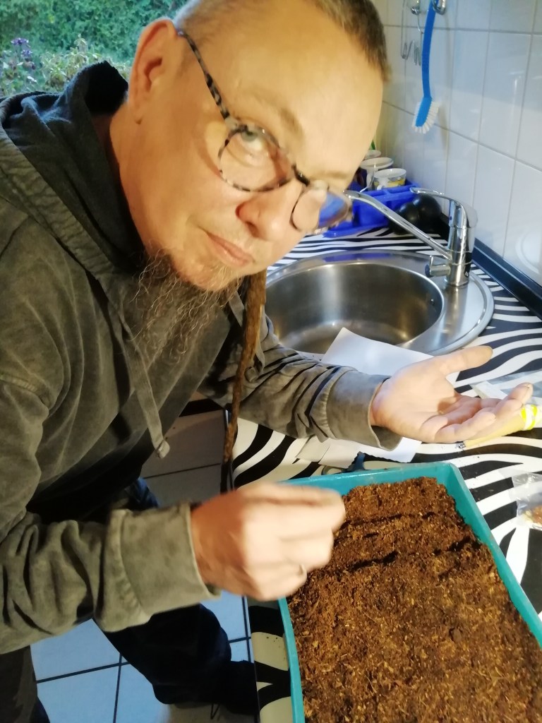 Ok, jetzt haben wir Samen. Wohin damit? Natürlich in die Erde. Aber auch das ist ein schwieriges Thema. Auf vielen Seiten schwören die Leute auf Anzuchterde. Das ist sehr teure Erde mit sehr wenig Nährstoffen, so daß die Pflanzen angeblich kräftig wurzeln. Für mich ist das ein Beutel Dreck für 6 Euro. Ich benutze die billigste Blumenerde, 1:1 mit Kokosfaser (gibt´s im Gartencenter, oft als Substrat für Terrarien) gemischt. Nährstoffarm und fluffig. Da wurzeln die Kleinen noch besser. Anfangs wird auch sonst kein Dünger eingesetzt.