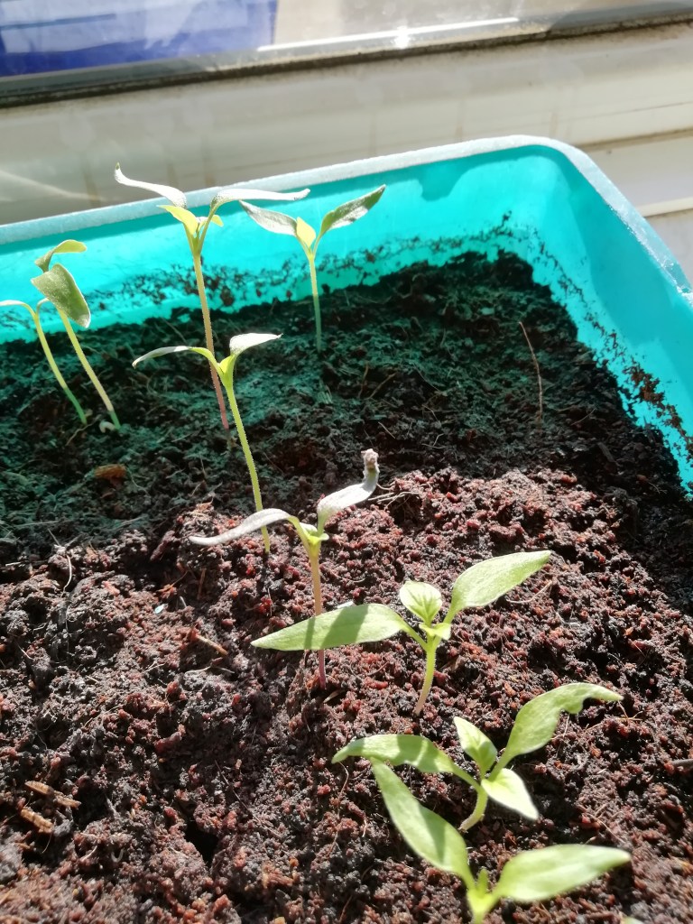 Jetzt sieht man, warum man vorsichtig angießen sollte. Alle Samen sind verschwemmt und ich weiß nicht, was was ist. Naja, sieht man dann später. Und wenn sie soweit sind wird´s Zeit, in eigene Töpfe umzuziehen. Aber damit geht´s im Teil 2 weiter.